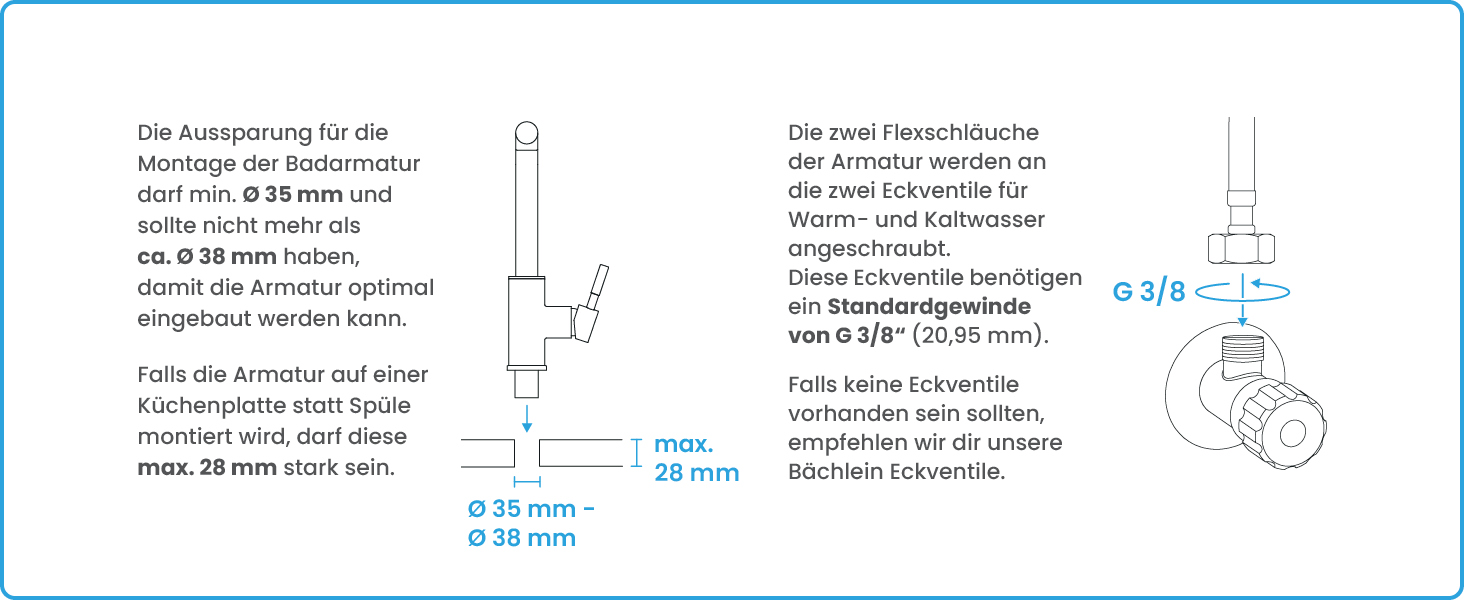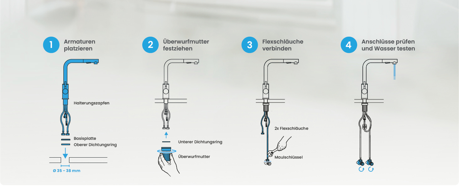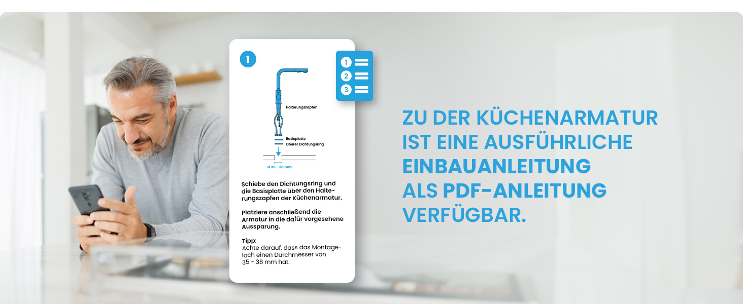 Dank der standardisierten G 3/8 Zoll Anschlussmaße der flexiblen Schläuche, ist eine unkomplizierte Inbetriebnahme des Wasserhahns gewährleistet. Der Wasserhahn lässt sich problemlos auf Spülen und Arbeitsplatten mit einer Dicke von bis zu 50 mm montieren. So integrieren Sie das Produkt nahtlos in Ihre Kücheneinrichtung.
