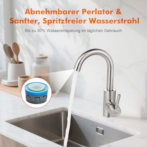 Die durchdachte Handhabung dieser Armatur sorgt für Komfort in Ihrem Alltag. Der Griff ist ergonomisch gestaltet und ermöglicht eine einfache Bedienung: Nach hinten zum Einschalten des Wassers und nach vorne zum Abstellen. Die Temperatur kann mit einer einfachen Drehung nach oben für warmes und nach unten für kaltes Wasser reguliert werden. Zudem sorgt der integrierte Perlator für eine Reduzierung von Spritzwasser und einen kontrollierten Wasserdurchfluss von etwa 10 L/min bei 2–3 bar – ein Beitrag zur Nachhaltigkeit und Wassereinsparung.