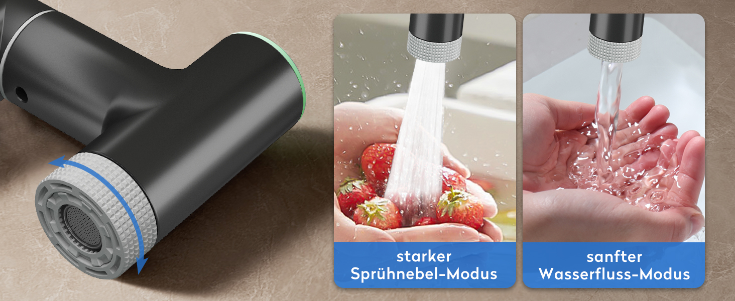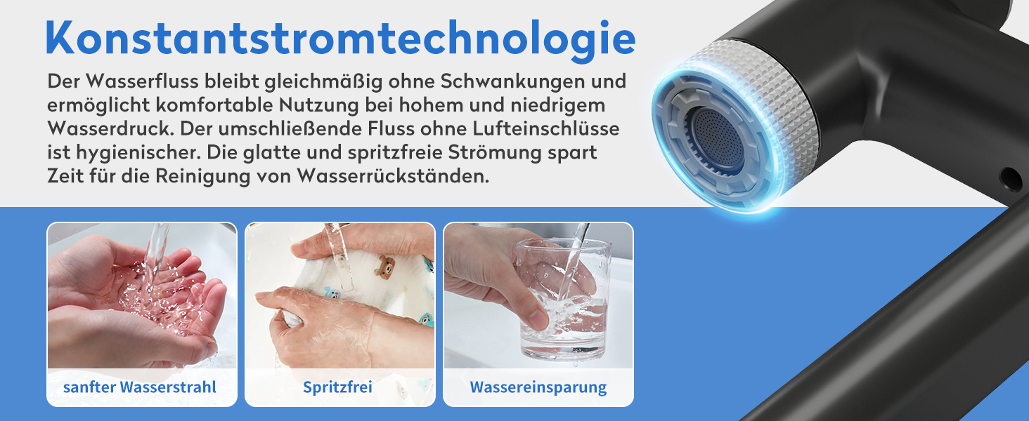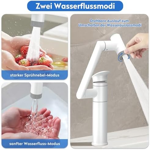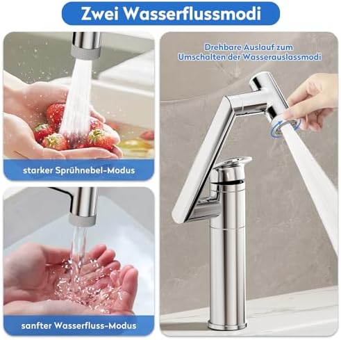 Mit der Möglichkeit, zwischen zwei Wasserfluss-Modi zu wählen, bietet unsere Waschbeckenarmatur sowohl einen starken Sprühmodus als auch einen sanften Sprudelmodus. Der leistungsstarke Sprühmodus ist ideal für schnelles Spülen und Dekontaminieren, während der sanfte Modus perfekt zum Waschen von Händen, Gesicht und Mund geeignet ist. Der Luftsprudler sorgt dafür, dass der Wasserfluss spritzwassergeschützt und gleichzeitig wassersparend ist – eine nachhaltige Wahl für Ihr Zuhause.