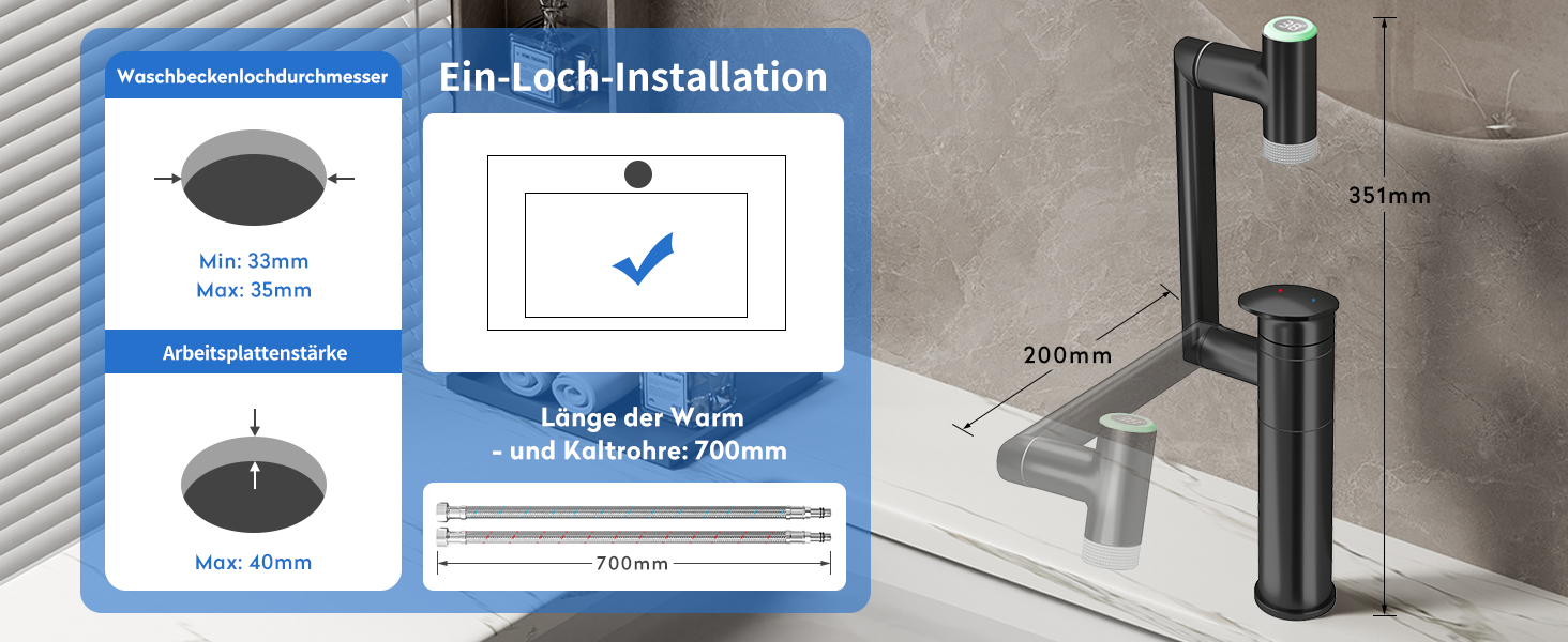 Die Armatur lässt sich mühelos mit einer Einlochinstallation montieren. Das Zubehör, das Sie hierfür benötigen, ist im Lieferumfang enthalten. Bitte beachten Sie vor dem Kauf die Dimensionen Ihres Waschbeckens: Der Durchmesser der Montagebohrung sollte zwischen 33 und 35 mm liegen und die maximale Deckdicke nicht mehr als 40 mm betragen. Die Länge der Kalt- und Warmwasserleitungen beträgt 700 mm. Bitte beachten Sie, dass die Ablaufgarnitur und die Wasserhahnabdeckplatte nicht im Lieferumfang enthalten sind.