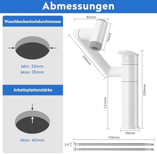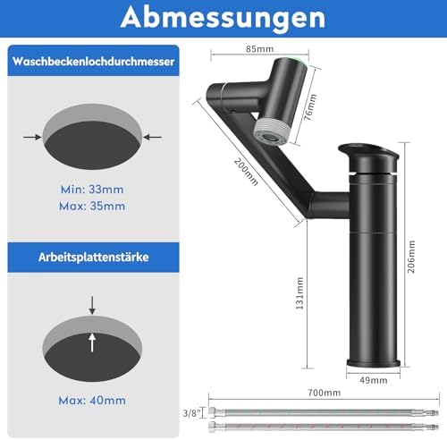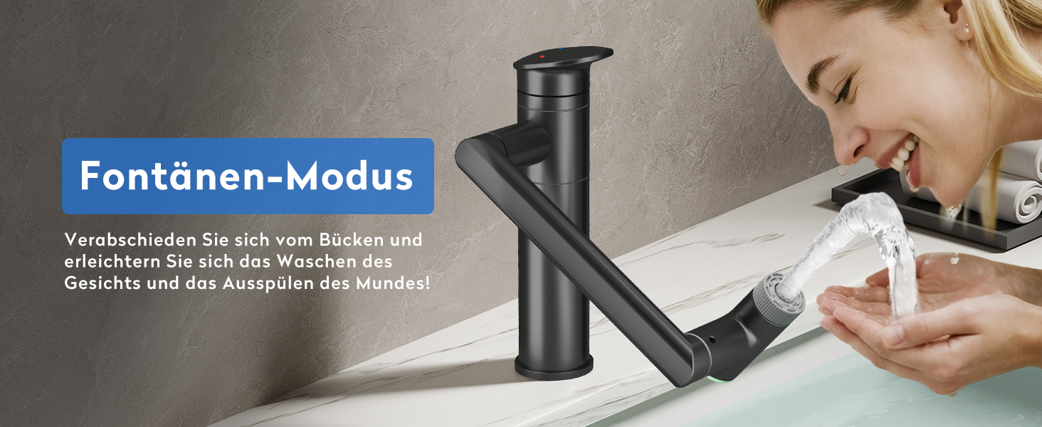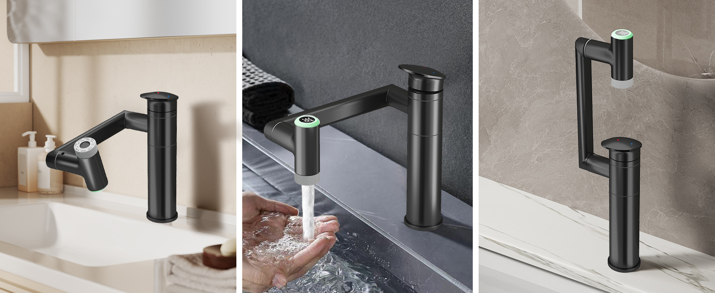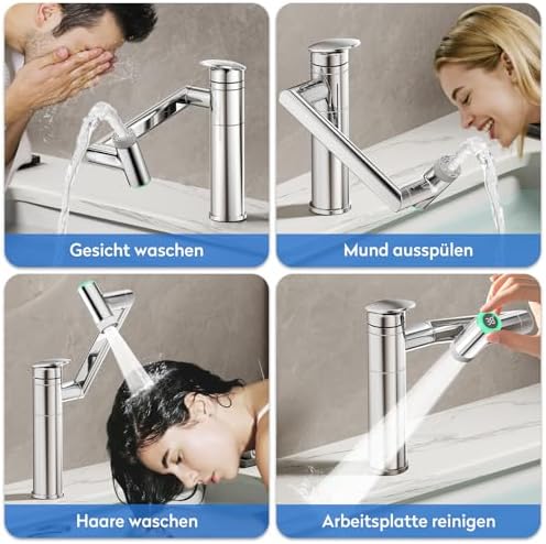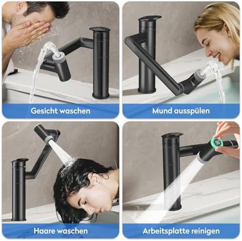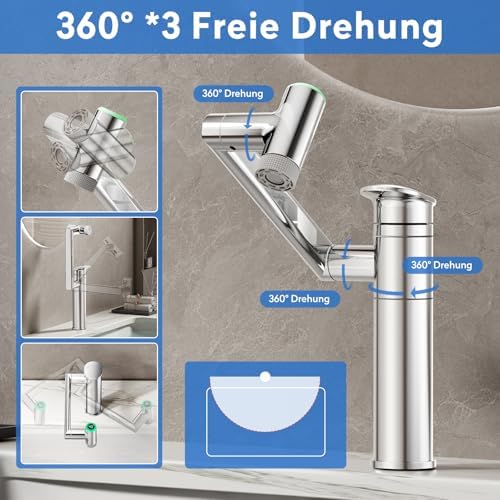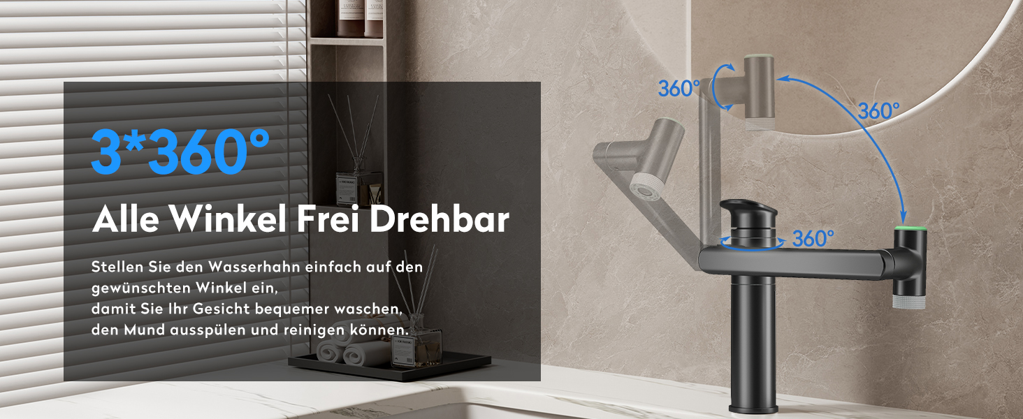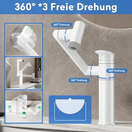 Die innovative 1080° drehbare Armatur für Ihr Badezimmer setzt neue Maßstäbe in der Flexibilität und Benutzerfreundlichkeit. Mit einem dreistufigen Design ermöglicht der Auslauf eine vollständige 360°-Drehung, die den Komfort beim Waschen erheblich verbessert. Der verstellbare Roboterarm kann leicht gebogen oder gefaltet werden, um die Höhe an Ihre individuellen Bedürfnisse anzupassen. Der große Auslauf von bis zu 274 mm minimiert das lästige Bücken und macht das Zähneputzen, waschen des Gesichts und Haare waschen zu einer mühelosen Angelegenheit.