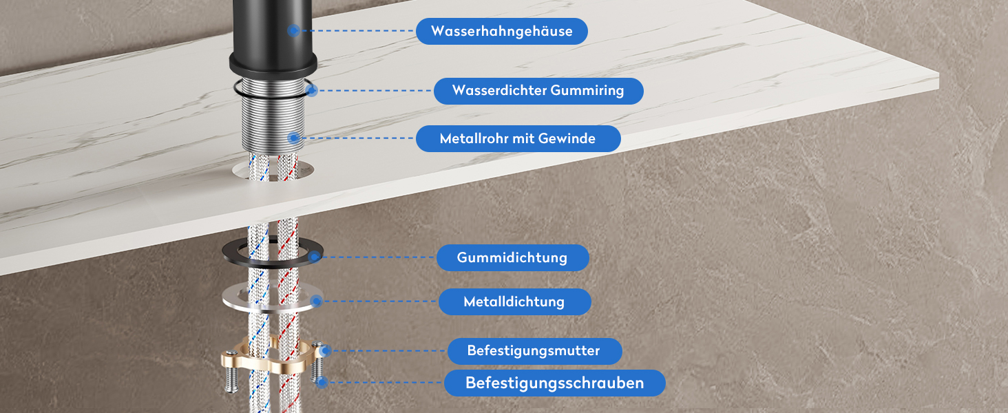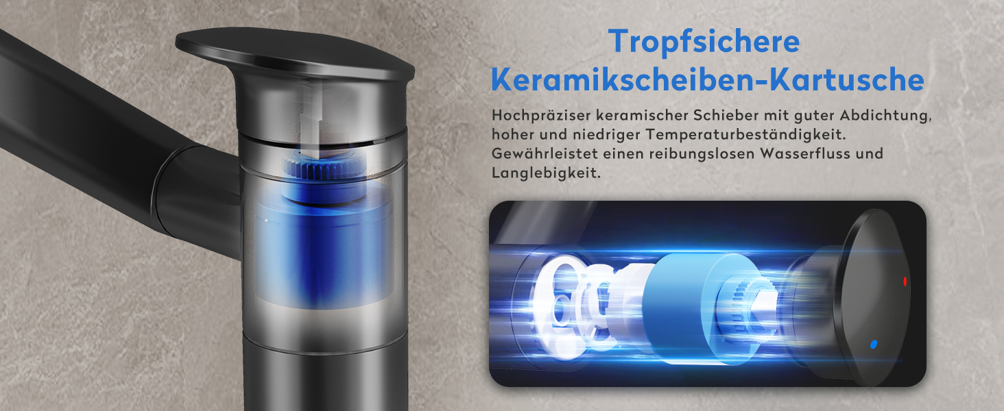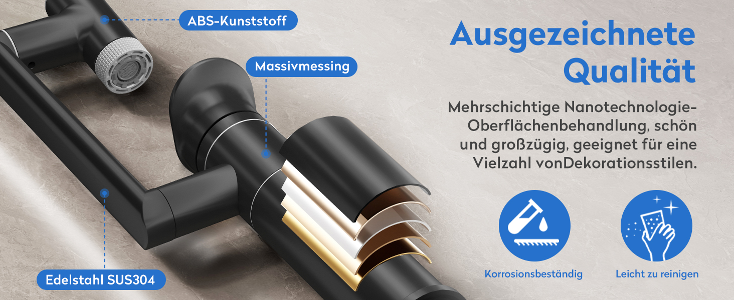 Hergestellt aus erstklassigen Materialien, garantiert unsere Armatur eine lange Lebensdauer und Zuverlässigkeit. Die keramischen Scheiben-Patronen bieten eine extrem hohe Dichtungsleistung, während die sorgfältige Oberflächenbehandlung dafür sorgt, dass die Armatur kratzfest ist und weniger anfällig für Fingerabdrücke und Wasserflecken bleibt. Der Auslauf besteht aus ABS-Kunststoff, der Körper aus hochwertigem Messing und die Roboterarme aus SUS304-Edelstahl – für eine Kombination aus Langlebigkeit und stilvollem Design.