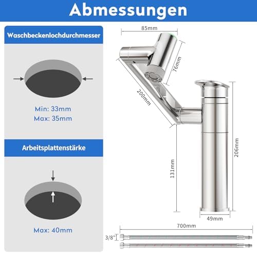 • Optimale Maße: Für Waschbecken mit Montagebohrungen von 33-35 mm Durchmesser und maximaler Deckdicke von 40 mm.
