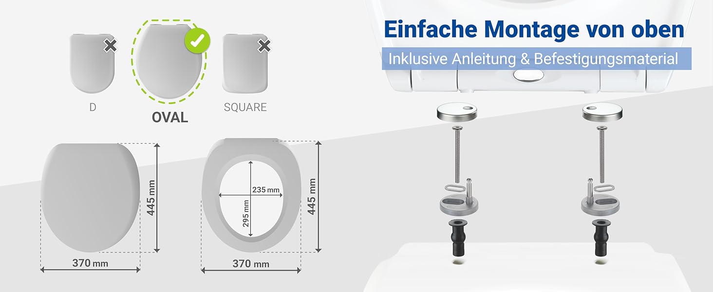 Im Lieferumfang ist der WC-Sitz Ostuni mit der praktischen Absenkautomatik von WENKO, inklusive Wandpuffer und Befestigungsmaterial enthalten. Die Maße sind optimal durchdacht: Der Deckel misst 37 x 44,5 cm, der Außenring hat die gleichen Maße, während der Innenring 23,5 x 29,5 cm misst. Der Befestigungsabstand variiert zwischen 7 und 17,5 cm, sodass der Toilettensitz zu den meisten Standard-WC-Anlagen passt.