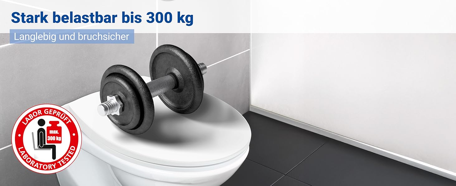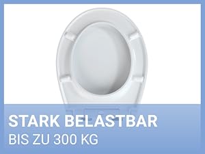 Der WC-Sitz besteht aus hochwertigem, recyclebarem Thermoplast. Dieses hygienische Material garantiert nicht nur einen angenehmen Sitzkomfort, sondern überzeugt auch durch seine Belastbarkeit von bis zu 300 kg, die laborbestätigt ist. Damit ist der Sitz sowohl für die tägliche Nutzung als auch für besondere Anlässe bestens geeignet.