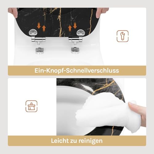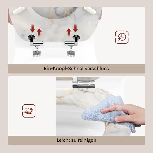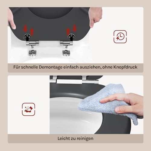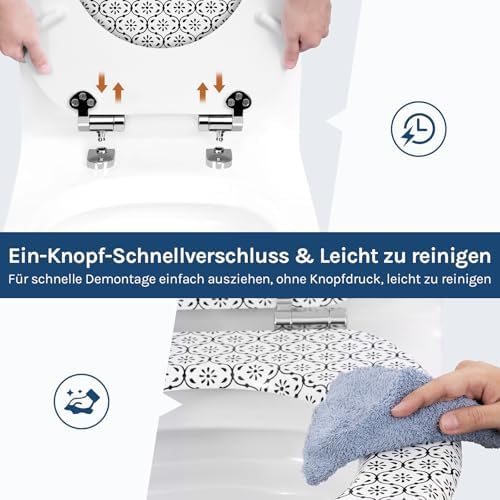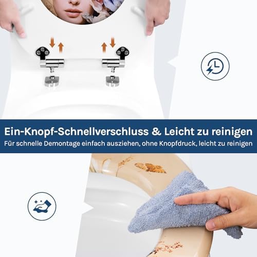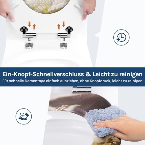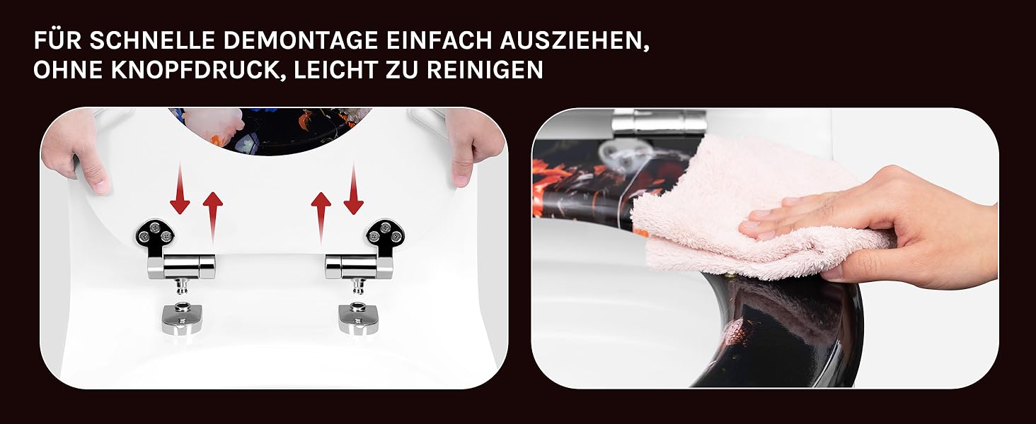 Die Reinigung ist ein Kinderspiel! Dank des praktischen Quick-Release-Mechanismus können Sie den Toilettensitz mühelos abnehmen. Heben Sie ihn einfach senkrecht an, reinigen Sie die Fläche gründlich und setzen Sie den Sitz danach wieder ein – ein Klick signalisiert Ihnen, dass alles an seinem Platz ist. So bleibt Ihr Badezimmer stets hygienisch und sauber.