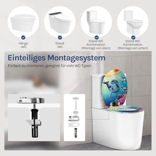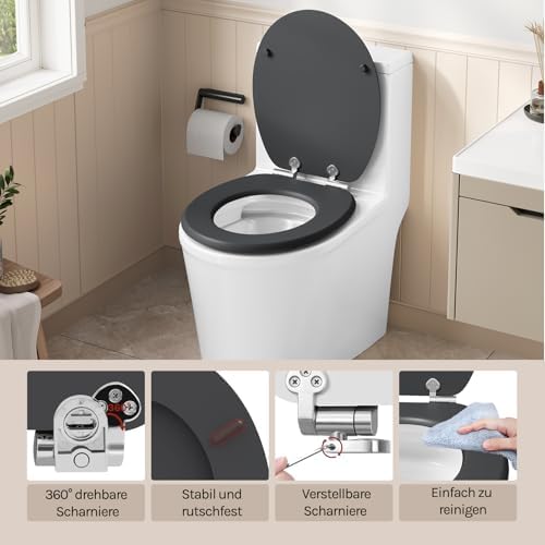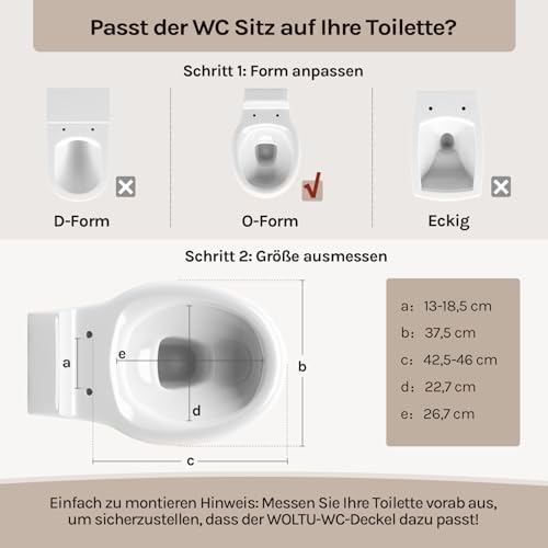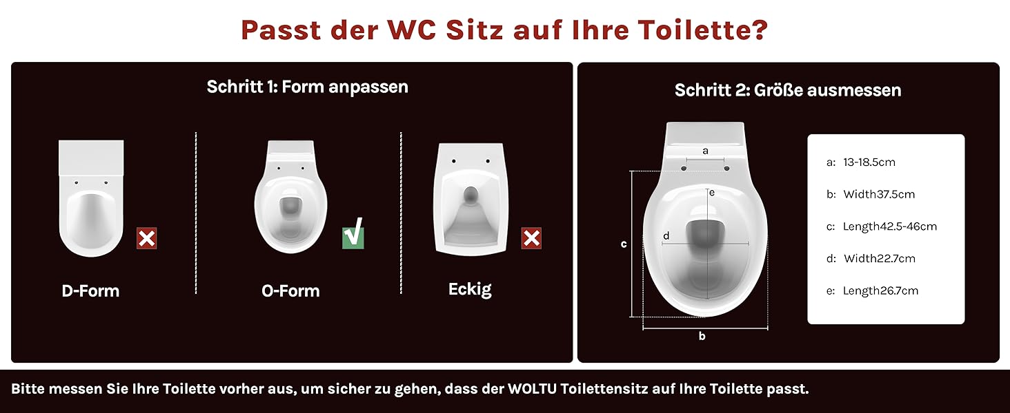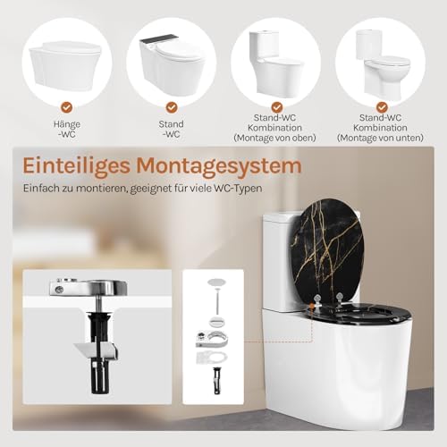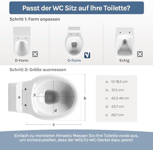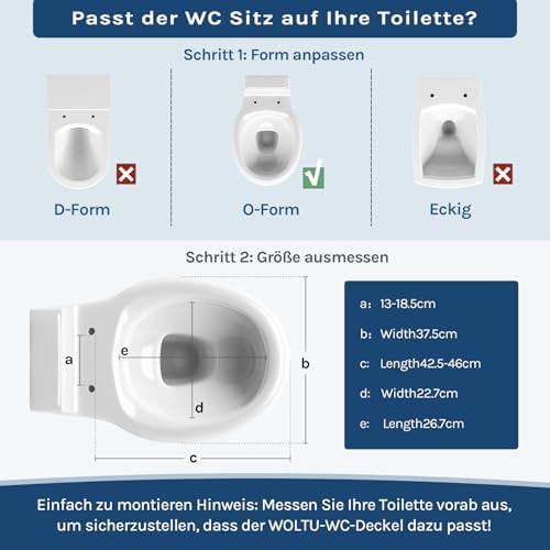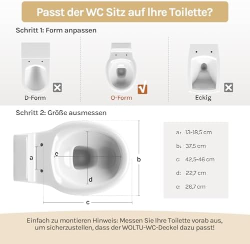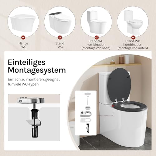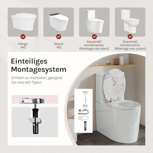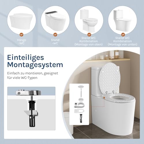 • Vielseitige Passform: Dank der robusten Edelstahlscharniere kann der WC-Sitz an nahezu allen gängigen O-förmigen Toiletten montiert werden, egal ob Wand-, Stand- oder Kombi-WCs.