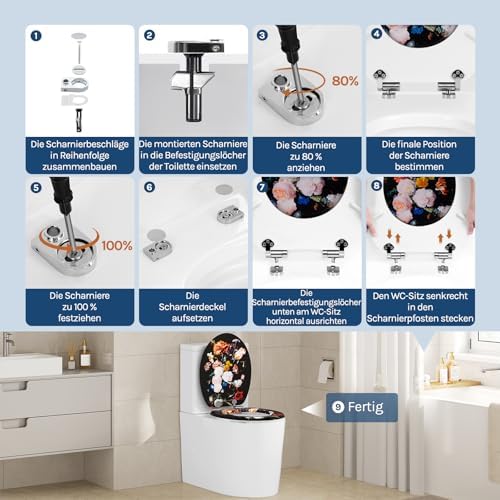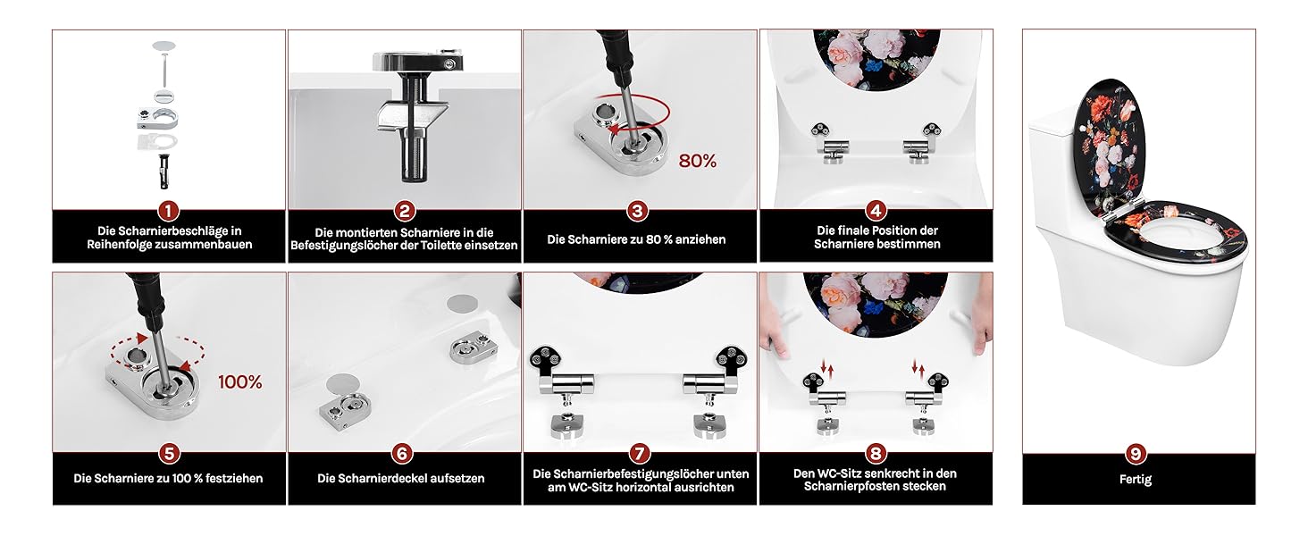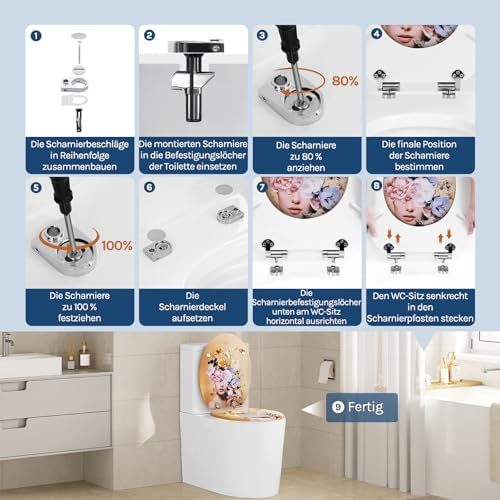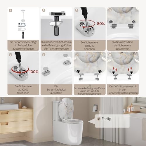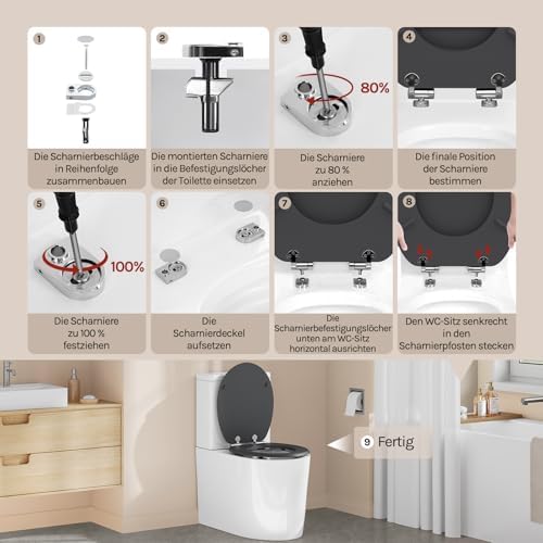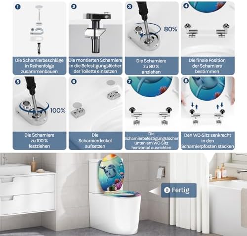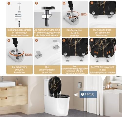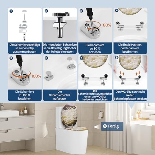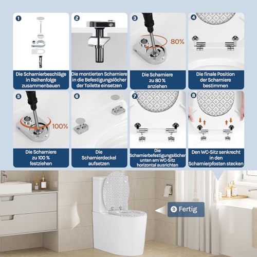 Für die unkomplizierte Montage sorgt die detaillierte Anleitung, die auch für Anfänger leicht verständlich ist. Das verbesserte Zubehörset ermöglicht es Ihnen, den Soft-Close-Toilettensitz in nur wenigen Minuten zu installieren. Selbst ohne handwerkliche Vorkenntnisse können Sie Ihr Badezimmer schnell in neuem Glanz erstrahlen lassen.