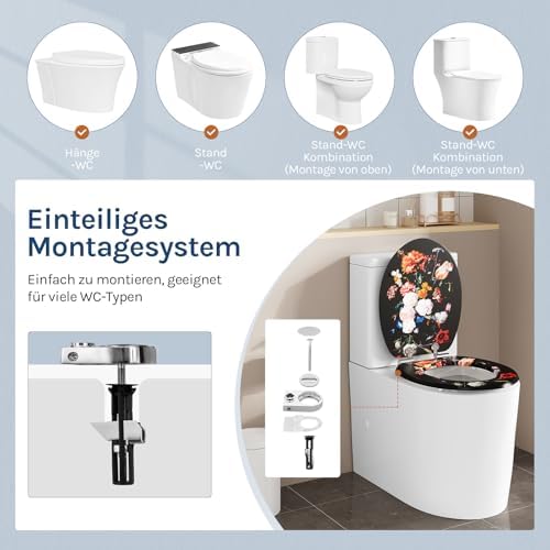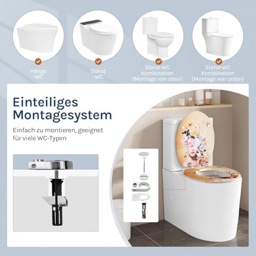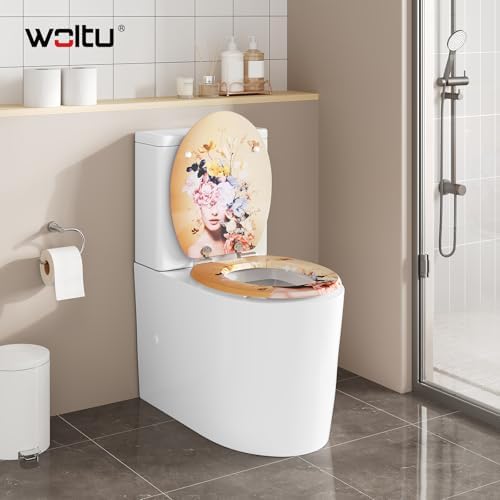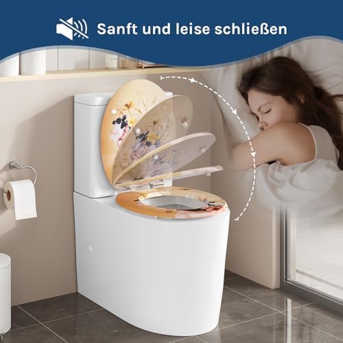WOLTU Toilettendeckel Holz mit Absenkautomatik, Blumen Motiv, O-Form – Einfach zu reinigender Klodeckel für stilvolles B