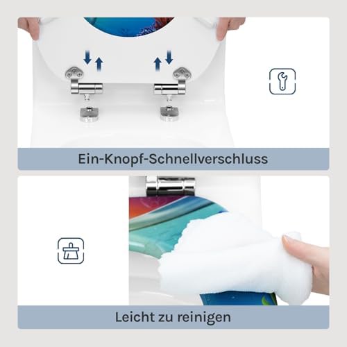 • Hygienisches Quick-Release System: Der Toilettensitz kann unkompliziert abgenommen werden, um eine gründliche Reinigung zu ermöglichen, und sorgt somit für ein stets sauberes Badezimmer.